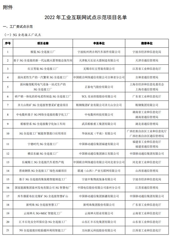 3月15日,工业和信息化部办公厅根据《工业和信息化部办公厅关于组织开展2022年工业互联网试点示范项目申报工作的通知》(工信厅信管函〔2022〕252号)要求,经企业自主申报、地方推荐、专家评审和网上公示,确定了2022年工业互联网试点示范项目名单,并予以公布。