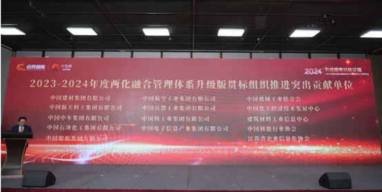 石化盈科助力中国石油化工集团有限公司荣获“2023-2024年度两化融合管理体系升级版贯标组织推进突出贡献单位”称号,九江石化获“2023—2024年度两化融合管理体系升级版贯标AAA级优秀企业”称号,海南炼化获“2023—2024年度两化融合管理体系升级版贯标AA级优秀企业”称号。
