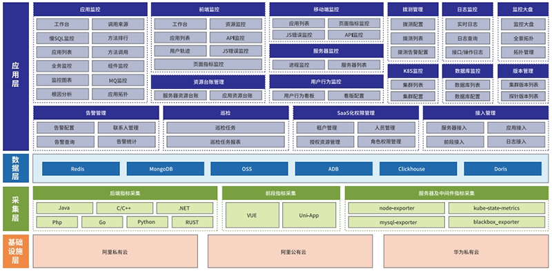 - 全方位监控:建立从前端到应用再到基础服务的纵向拓扑,实现应用列表可视、业务流程可视、全链路监控、监控大盘等功能。