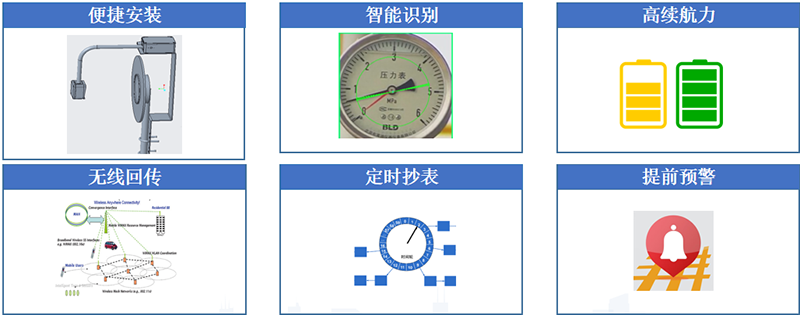 智能抄表仪可自适应安装环境:安装位置、明暗、反光、井下或水下等条件,全面覆盖厂区装置里的水表、压力表、流量表、特殊类型表等不同类型的指针表或数字表。